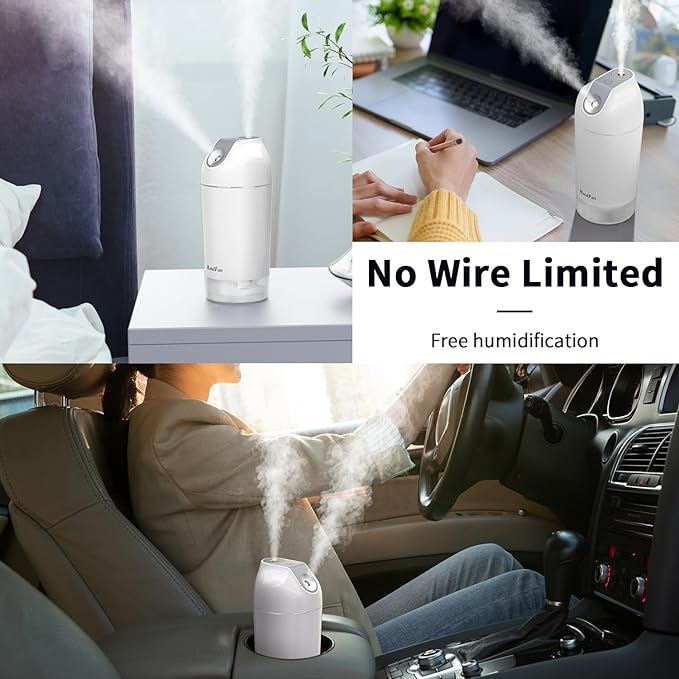 - Wireless Humidifier: Powered by rechargeable lithium battery, this battery humidifier can be put on anywhere without the limitation of wires. Enjoy the cool mist anywhere freely, perfect for office, bedroom, reading room, car, travel, etc.